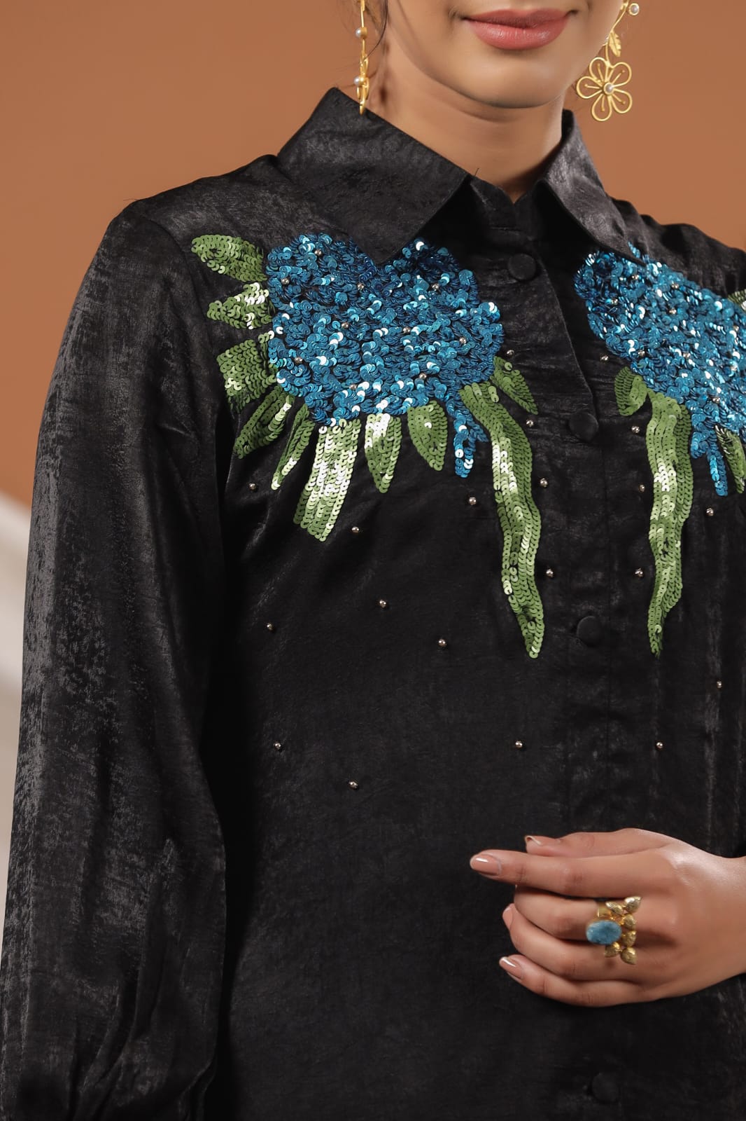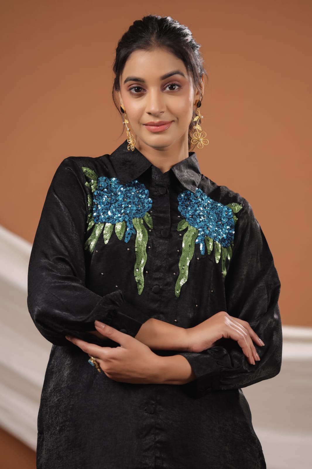 This black co ord set is a stylish and comfortable fashion choice. Made with imported fabric, it features intricate sequence work for a premium look. Perfect for any occasion, this set is a must-have for your wardrobe.